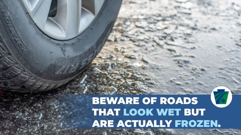 Roads that may look wet, but are actually frozen, are often referred to as “black ice.” Black ice is transparent, allowing the color of the road to show through, creating a hazard to drivers. When the road looks wet, but no spray is coming from the tires of other vehicles, black ice may be present.