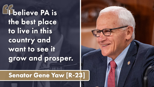 Dear Friends, Hello! Thank you for subscribing to my E-newsletter. I am honored to serve the 23rd Senate District and look forward to working with you toward building a better future for Pennsylvania! This E-newsletter serves to keep you updated on what is happening throughout Bradford, Lycoming, Sullivan, Tioga and Union counties and what I am doing as your state senator in Harrisburg. I hope that you will find this E-newsletter helpful, and if you have any questions or concerns, please feel free to contact me. Gene Yaw